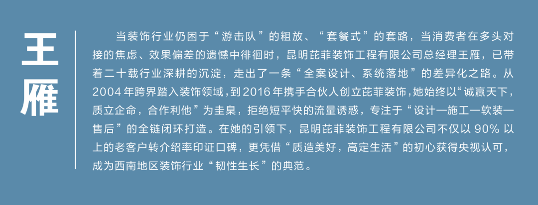这套全案闭环系统,不仅让芘菲装饰的客户满意度高达95%以上,更让它在行业中树立了“标杆”。如今,芘菲的业务已从昆明辐射到深圳、上海,甚至延伸到新加坡、缅甸等海外市场,为上市公司设计办公大楼、为连锁品牌打造门店、为海外业主定制住宅……“全案模式的核心,不是‘做多少业务’,而是‘做好每一个业务’。”王雁说,“只要我们能把‘全案闭环’做深做透,就能让更多业主感受到‘装饰的美好’。”